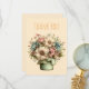 Thank you card with a cute image. Blue. pink and cream colored flowers with green leaves. Set inside a green flower pot with a green plaid cloth hanging over the side.