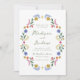 Celebrate your wedding day with charming watercolor elegance using this whimsical folk art floral wedding invitation. The design features the couple’s first names displayed in green handwritten script at the center, creating a romantic and personal focal point. A delicate oval frame of hand-painted folk art florals and botanical accents surrounds the text, showcasing colorful blooms and greenery in shades of blue, pink, golden yellow, orange, and green. The symmetrical arrangement creates a graceful, balanced composition that feels both playful and refined. Perfect for garden weddings, outdoor ceremonies, and couples drawn to artistic watercolor wedding stationery, this invitation offers a distinctive and memorable way to share your special day with family and friends.