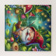 Ein fröhlicher Garten-Gnome, der unter bezaubernder Waldbeleuchtung von einem Teich umgeben ist und von lebhaften Blume, Pilzen und einem Lilienblock mit Frosch begleitet wird.