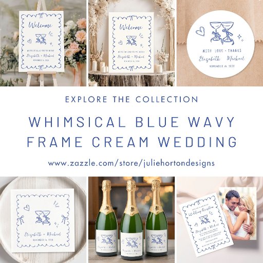 Quirky Retro-inspirierte Hochzeitsempfehlung mit französisch-blau-gewelltem Rahmen mit Kokettenbögen, skurrilen handgezeichneten Herzenzeichnungen, Sternen und Weingläsern, "Wedding Reception" und den Namen von Braut und Bräutigam in einem lustigen, spielerischen blauen Drehbuch.