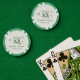 Trendy light cream poker chips for your wedding parties and reception featuring green whimsical hand-drawn illustrations of a heart, stars and wine glasses and the names of the bride and groom in a playful green script.