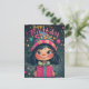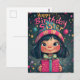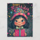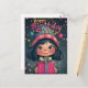 Dies ist ein wunderschön illustriertes Geburtstagsdesign mit einem niedlichen, mit Augen Mädchen mit dunklem Haar, rosigen Wangen und einem hellen Lächeln. Sie trägt einen farbenfrohen gestreiften Hut mit einem Pompom, der dem lebhaften und festlichen Hintergrund mit schwebenden Blasen, Sternen und magischen Glitzern entspricht. Die herzliche, von Hand gezeichnet Typografie der "glücklichen GeburtstagsSchwester" fügt eine spielerische Touch hinzu, die das Thema Freude und Feiern ergänzt. Das umhüllte Geschenk mit einem dekorativen Bogen verstärkt das Geburtstagsthema und macht dies zu einem idealen Gruß.