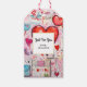 Geschenke Tags mit einem skurrilen Muster. Scrapbook Stil Doodles und Skripte. Rote und rosa Herzen und verschiedene Briefe und Umschläge verstreut herum.