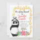 Whimsical Momma Panda mit Keule auf ihrem Kopf, handgezeichnete golddoodle Rahmen und Blume werden von vollständig anpassbaren Baby-Duschdetails in modernen Schriftart begleitet.
