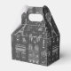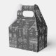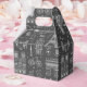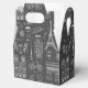Whimsical Gefallen Box / kleine Bäckerei Box Muster zeigt alle besten von Paris Leben, vom Eiffelturm und Arc de Triomphe, Bistro Sitzplätze und Makaronen. Weiße Doodles auf grauem Chalkboard-Hintergrund.