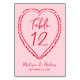 Führen Sie Ihre Gäste zu ihren Plätzen mit diesen charmanten Hochzeitstisch-Nummern-Karten, die darauf ausgelegt sind, mit spielerischer, Valentinstag-inspirierter Hochzeitsdekoration zu koordinieren. Das Design zeigt ein handgezeichnetes rotes Herz, das die Tischnummer umgibt, die in einer handgeschriebenen roten Schrift auf einem weichen rosa Hintergrund angezeigt wird. Die Namen des Paares und das Hochzeitsdatum werden darunter angezeigt, um einen charmanten persönlichen Touch hinzuzufügen. Das Design wiederholt sich auf der Rückseite für ein einheitliches und poliertes Aussehen auf Ihrer gesamten Feier. Perfekt für Februar-Hochzeiten, Valentinstag-Hochzeiten oder Paare, die lustige, moderne Korrespondenzartikel mit einem retro-inspirierten Stil lieben, fügen diese Tischnummer-Karten Persönlichkeit und Romantik zu Ihrer Tischdekoration hinzu. Diese Karte misst
