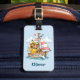 This charming personalized sailor bear luggage tag features an adorable brown bear wearing a classic yellow rain slicker and hat, happily steering his wooden boat.