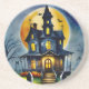 Whimsical Spuk Sand Stone Untersetzer: Ein spielerisches Beispiel für ein charmantes Spuk Haus unter einem glühenden Vollmond, mit Fledermäusen, einer freundlichen Veranda und einem Kürbisgeflecht, das hinter einem Zaun versteckt ist.