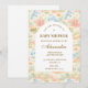 A whimsical watercolor design featuring a playful mix of pastel summer animals surrounded by tropical leaves, seashells, starfish, and soft botanical details. The cheerful palette of peach, mint, coral, and soft blue creates a light storybook atmosphere, while the elegant arch layout keeps the celebration details beautifully framed and easy to read. Perfect for a warm, joyful summer celebration with a charming nursery aesthetic.