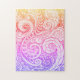 Dieses Rätsel zeichnet sich durch ein kompaktes abstraktes Design aus, das mit wirbelnden, spiralförmigen und federähnlichen Mustern gefüllt ist. Das Kunstwerk geht sanft durch einen Farbverlauf von warmen bis coolen Farben über - angefangen bei Gelb und Orange oben, über Rosa, bis hin zu Blau und lila Farbtönen ganz unten. Der Gesamteindruck ist lebendig und dynamisch, mit einem handgezeichnet, whimsikalen Gefühl.