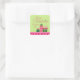 Cet autocollant carré arrondi de noël a un jeu de couleurs rose et vert. Il y a trois cadeaux sur le fond avec une bordure de flocons de neige rose chaud. Vous pouvez facilement customiser l'année et le nom de votre famille. Oeuvre de Kelly Medina