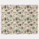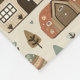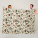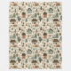 Cottage core throw blanket with a cute village of cottages and trees, mushrooms, flowers in green, brown, and earthy tones.