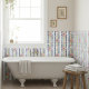 Weiße Aquarellblüte und Streifen mit einem Muster von korallenfarbenen Blume und fett blauen Streifen, durchzogen von zartem grünem Blattwerk und gepunkteten Akzenten. Das einzigartige, handbemalte Ambiente verleiht Küchen, Bädern und allen Bereichen, die einen freundlichen Aufzug benötigen, eine Touch künstlerischen Charmes. Fügen Sie Ihrer Zuhause eine skurrile künstlerische Touch hinzu!