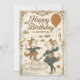 Diese Vintag inspiriert Geburtstagskarte besticht durch zwei charmante anthropomorphe Füchse, die in einem wilden Waldgebiet fröhlich feiern. Das Design in einer sepia- und himmelblauen Palette auf strukturiertem, gealtertem Papier präsentiert aufwändige Dekorränder, blumengeschmückte Schnörkel und Fantasieelemente wie Lächeln, schwebende Wolken und zartes Scrollwork. Die spielerische Szene umfasst einen gestuften Kuchen, einen Ballon und fröhliche Ausdrücke, alles unter dem kühnen und schön handgeschriebenen "Happy Birthday" Gruß. Die Illustration verbindet nostalgische Märchenästhetik mit einer weichen, herzzerwärmenden Stimmung, die perfekt für die Erweckung von Kindermagie und zeitlosen Feiern geeignet ist.