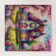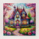 Eine lebendige Szene einer skurrilen Hütte, umgeben von blühenden Blume, mit Buntglasfenstern und aufwändigen Details, die eine magische Atmosphäre schaffen.