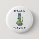 Button mit einer Abbildung, die eine gruselig aussehende Katze zeigt, die mit einem Plastikbecher auf dem Kopf wie ein Helm sitzt. Es ist ein humorvoller, leicht sarkastischer Blick auf Katzen, Ungeziefer und die "natürlich würde mir das passieren" Momente.