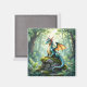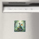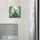 Dragon-Magnet. Ein skurriler Drache, der in einem detaillierten Aquarellbild dargestellt wird, erhebt sich auf einer moosbedeckten alten Steinruine. Sonnenlicht filtert durch die dichte Baumkronen und beleuchtet Staubmotten, die in der Luft tanzen. Die Waage des Drachen schimmert mit schillernden Tönen, und seine Augen halten eine sanfte, wissende, lustige Fantasiekunst. Niedlich für den Raum eines Jungen.