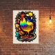Dieser Hahn ist in einem spielerischen, Cartoon-ähnlichen Stil mit bunten Federn dargestellt. Die Gesamtwirkung des Kunstwerks ist skurril und spielerisch, mit einem Gefühl von Spaß und Spaß. Die lebhaften Farben und die lebendige Komposition machen es zu einer idealen Wahl.