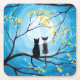 Zwei Katzen sitzen auf einem Ast und schauen den Vollmond mit einem blauen Himmel voller Sterne an. Die Zweige der Bäume, die sie umgeben, sind mit kleinen gelben Blumen geschmückt. Schwarze Tuxedokatze und eine gepunktete Katze in zwei Farben. Original Moderne Akrylmalerei von Donna Leger. Alle Rechte vorbehalten. ©irony Designs