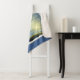 Die Fun Holiday Sherpa Decke bietet eine skurrile und surreale Weihnachtswaldszene mit schneebedeckten Bäumen, die mit KI-Software erstellt wurde. Der Text "Happy Holidays" auf blauem Hintergrund ist anpassbar.