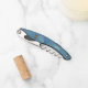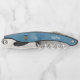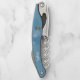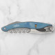 Dieser Korkenzieher ist blau mit einem Kreismuster und Strichen mit einer kahligen Eule mit einem gelben Körper, blauem Kopf und großen blauen Augen. Passen Sie Ihren Namen oder Text mit den Vorlagen auf der Vorder- und Rückseite an.