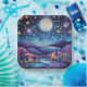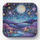 Papier Teller mit einer schönen Abbildung. Whimsical und fantasievoll vibe. Ein großer leuchtender Mond mit Sternen überall. Hängend über eine schöne Landschaft von Bäumen, Bergen und einem gewundenen Fluss. Phantastisches magisches mystisches Flair.