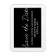 Whimsy Save the Date Magnet in Schwarz und Weiß mit einem einfachen und lustigen Skript Typografie-Design. Diese trendy speichern Sie den Datums-Magnet ist einfach, um Ihre Hochzeitsdetails anpassen. Klicken Sie für weitere Anpassungsoptionen auf die Schaltfläche Anpassen.