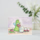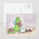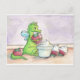 Niedlicher kleiner grüner Drache, der Erdbeeren in Sahne taucht.
