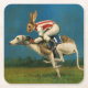 Dieser Untersetzer ist illustriert mit einem Kaninchen, der auf einer Rennkuppe reitet.