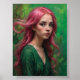 A dreamy portrait of a young woman with flowing pink hair in a green blouse, gazing thoughtfully amid a lush, natural backdrop.