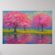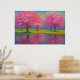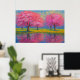 A symphony of spring unfolds in this impressionistic landscape, where blooming cherry blossoms shimmer in hues of pink, crimson, and violet. Their delicate forms stretch skyward, mirrored in the still waters below, creating a dreamlike duality. The golden sky—caught between sunrise and memory—casts a gentle glow across the meadow, where red and yellow wildflowers whisper in the breeze. Birds drift silently overhead, adding motion to the stillness, presence to the peace. This piece invites quiet reflection, evoking the fleeting beauty of light, nature, and time suspended.