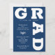 GRAD in fett marineblauen Schriftzeichen rund um die Ränder dieser weißen Hintergrund Graduation Party Einladungen. SIEHE GANZE SAMMLUNG von vorgefertigten Farbkombinationen, Papier-Teller, Servietten, Gunst-Boxen und Graduierungsparty Einladungen in unserem Shop.