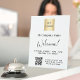 Classic, modern elegant white background. Personalize and add your company name, opening hours, business logo and your QR colde to your website or social media account. Black text.