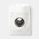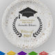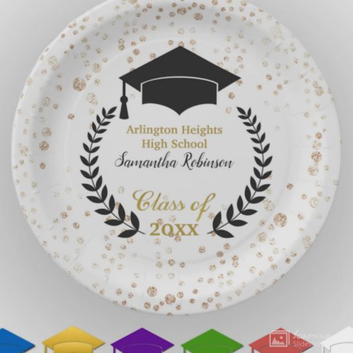 Paper favor bags for that special high school or college graduation party with personalized text. Features image of a white grad cap and laurel wreath on a round black logo and accented with faux gold confetti. See matching plates, napkins and other color groups also available in this same design