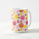 White ceramic mug featuring a pattern of colorful clocks and pocket watches in red, pink, yellow, and orange tones on a light background. Playful and vibrant.