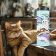 Eine hübsche, weiße Katze mit Feenflügeln, die auf einem Pilz sitzt, mit Blume in einem hellblauen Hintergrund