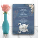 Ein ruhiger, weißer Schwan schwimmt neben einem Strauß mit weißen Rosen, sein Spiegelbild gibt ein Spiegelbild vor einem tiefblauen abstrakten Hintergrund. Über dem Schwan ist Ihr individueller Hochzeitstext in Weiß. Oben rechts ist ein passendes Rosenbukett, und eine Rose Goldlinie Blumenbild gleicht die links Seite aus. Die Rückseite der Einladung hat den gleichen Farbverlauf abstrakt blauen Hintergrund, mit einem winzigen, weißen Rosenemblem unten. Sehr elegant!
