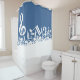 Im Badezimmer kann man sich herrlich entspannen und nach Herzenslust singen, denn der Duschvorhang mit seinen weißen, gelben Noten und einem großen, auf Schieferblau aufgestellten Treppenspieß ist mit dem Fußboden des Badezimmers völlig frei.