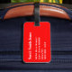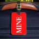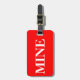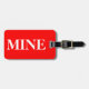 Gepäckanhänger mit Namen und Adresse mit einem weißen "MINE" auf einem roten Hintergrund. Personalisieren Sie Ihre Namen- und Adressinformationen mithilfe der einfachen Vorlagen.