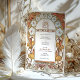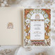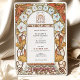 Diese exquisite Jugendstil-Hochzeitseinladung besticht durch ein Vintag-inspiriertes Design, das mit aufwändigen Blumenwerken geschmückt ist. Die Grenze besticht durch ihre eleganten, weißen Morgengläsern mit rosa Mittelpunkten und orangefarbenen Lilien, die mit anmutigen goldfarbenen Blätter und wirbelnden Akzenten verwoben sind. Das harmonische Arrangement verbindet sanfte Pastellfarben mit erdigen, warmen Farbtönen und schafft ein romantisches, zeitloses Ambiente. Das symmetrische, blumengeschmückte Ambiente verleiht dem Hotel einen eleganten und naturgetreu inspirierten Raum für Veranstaltungsdetails. Der künstlerische Stil ehrt die Jugendstil-Ästhetik des frühen 20. Jahrhunderts, die durch ihre fließenden Linien und botanischen Motive gefeiert wird.