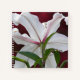Standardgröße, spiralgebundenes Notebook zum Schreiben oder Skizzieren, das ein farbiges Foto-Bild der Rückseite einer weißen Orientalischen Lily-Blüte vor einem verwischten Hintergrund eines brennenden roten Burning Bush-Büschels zeigt. Ein schönes, blumengeschmücktes Design! Wählen Sie Ihre Optionen für den Notebookstil aus.
