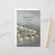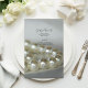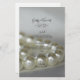 Das elegante "White Pearls Wedding Menu" mit den Details des Essens, das Sie am Mittag Ihres Brautparty servieren, nach dem Hochzeitsbrunch oder dem Hochzeitsessen Empfang, indem Sie den Salat oder den ersten Gang, Vorspeise oder Zweitgang und Dessert oder dritten Gang hinzufügen. Personalisieren Sie es mit den Namen der Braut und Bräutigam, Veranstaltungsort und Datum. Dieses edle Hochzeitsmenü bietet ein nahes Foto einer Perlenhalskette mit grauem Hintergrund.