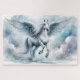 A graceful white pegasus rises through a dreamy sky, its wide feathered wings unfolding against soft washes of misty blue and cloudlike textures. Gentle watercolor blending creates an ethereal, almost storybook atmosphere, where light and air feel weightless and serene. Flowing mane and delicate movement give the scene a sense of quiet strength and freedom, while the cool pastel palette adds a calming, celestial mood. This enchanting composition blends fantasy with softness, evoking peaceful wonder, hope, and timeless beauty in a light, airy style. AI generated artwork.