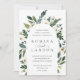 Unsere Einladung zur Trauung von White Peony umgibt Ihre Hochzeitstage-Details mit einem anmutigen Bogen von bemaltem Aquarell, botanischem Blattwerk und weißen Rosen und Blume aus Peony.