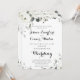Eine elegante, ganz weiße Hochzeitseinladung mit einer zarten Aquarell aus weißen Tornfloralen und silbernen Salbei Eukalyptusgrün mit einer lebendigen, kalligraphischen Hochzeitsschrift, die Ihre Hochzeitsdetails ankündigt.