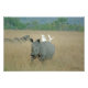 Foto eines weißen Nashorns mit zwei weißen Rinder-Frettchen auf dem Rücken; die Frettchen haben ihre Flügel ausgebreitet, während der Nashorn auf die Kamera zusteuert; zwei Zebras im Hintergrund; alle unter einem großen gelben Gras. Phinda Forest Reserve, Südafrika. Wir sahen viele weiße Nashörner in Südafrika, sowohl Single Tiere als auch Gruppen von fünf oder sechs. Weiße Nashörner haben ein recht schlechtes Sehvermögen, aber ihre Sinne von Hören und Geruch sind sehr gut. Ihre Lebensdauer beträgt etwa 40 Jahre, wenn sie vor Wilderei geschützt sind.