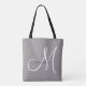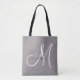 Personalisierte mit Monogramm, schwarz-weiße Tasche mit Tote-Design mit einem Script-Schriftart-Design auf einem bedruckten Imitat graue Leinen Foto-Effekt Hintergrund. Trendy typografischer Stil.