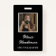 Vergewissern Sie sich, dass die Leute wissen, wer Sie sich an Ihrem Stand befinden, durch Veranstaltungen und Messen gehen, mit diesem schwarz-weißen Foto-Namensschild, das eine weiße Schrift, moderne Typografie und ein persönliches Foto mit weißem Rand auf beiderseitigem schwarzem Hintergrund aufweist.