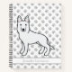 Desteis originelle Cartoon-Illustration eines niedlichen Weißen Hirten / Weißen Schweizer Hirten / Weißmantel Farbe Deutscher Schäferhund züchten Hund. Es gibt auch einen personalisierbaren Textbereich für den Titel des Notebooks. Der Hintergrund weist ein Muster grauer Hundepfoten auf.