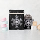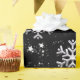 An elegant Christmas wrapping paper design featuring white snowflakes and stars set against a black background.